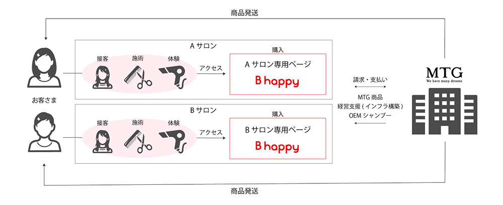 「B happy」は、お客様が定期的に通う美容室、エステ、ネイルなど、全国42万店舗を超えるビューティーサロンのプロフェッショナルたちによる接客時間を新たな価値あるメディアと捉えた、O2Oサロンプラットフォームです。「B happy」加盟店においては、プラットフォーム上に設けた自店舗専用のオンラインショップより、店舗での接客でつながったお客様に、それぞれのサロンブランドのシャンプー、トリートメントなどサロンが扱う商品や、当社製商品をいつでもお買い求めいただけるサービスの提供が可能となります。