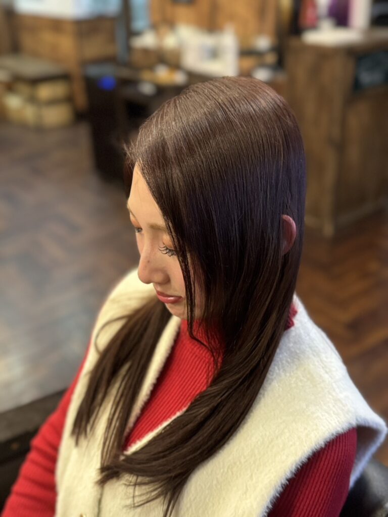 髪をきれいに見せるためのピンクブラウンです。