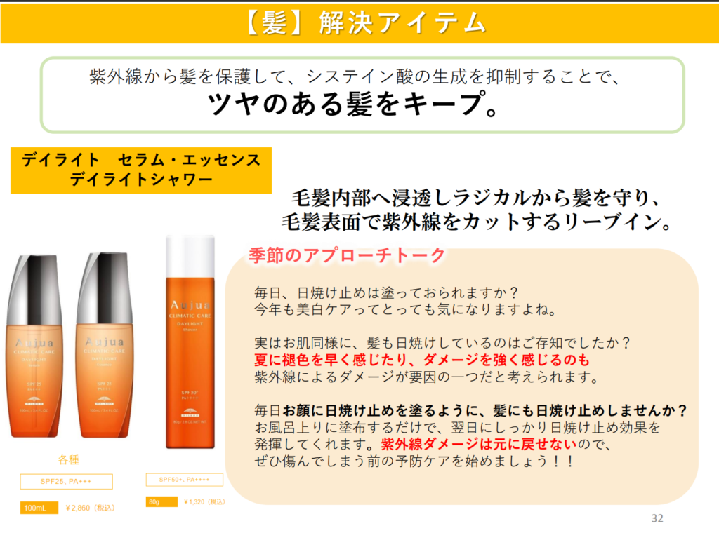 Aujuaのデイライトです(^^♪従来の一般的な髪の日焼け止めは髪の表面をコートして紫外線のダメージを抑えるものでしたが、こちらは髪の表面で紫外線の侵入をブロックするとともに髪の内側では活性酸素が発生するのを抑えてダメージを予防してくれます(*^^*)