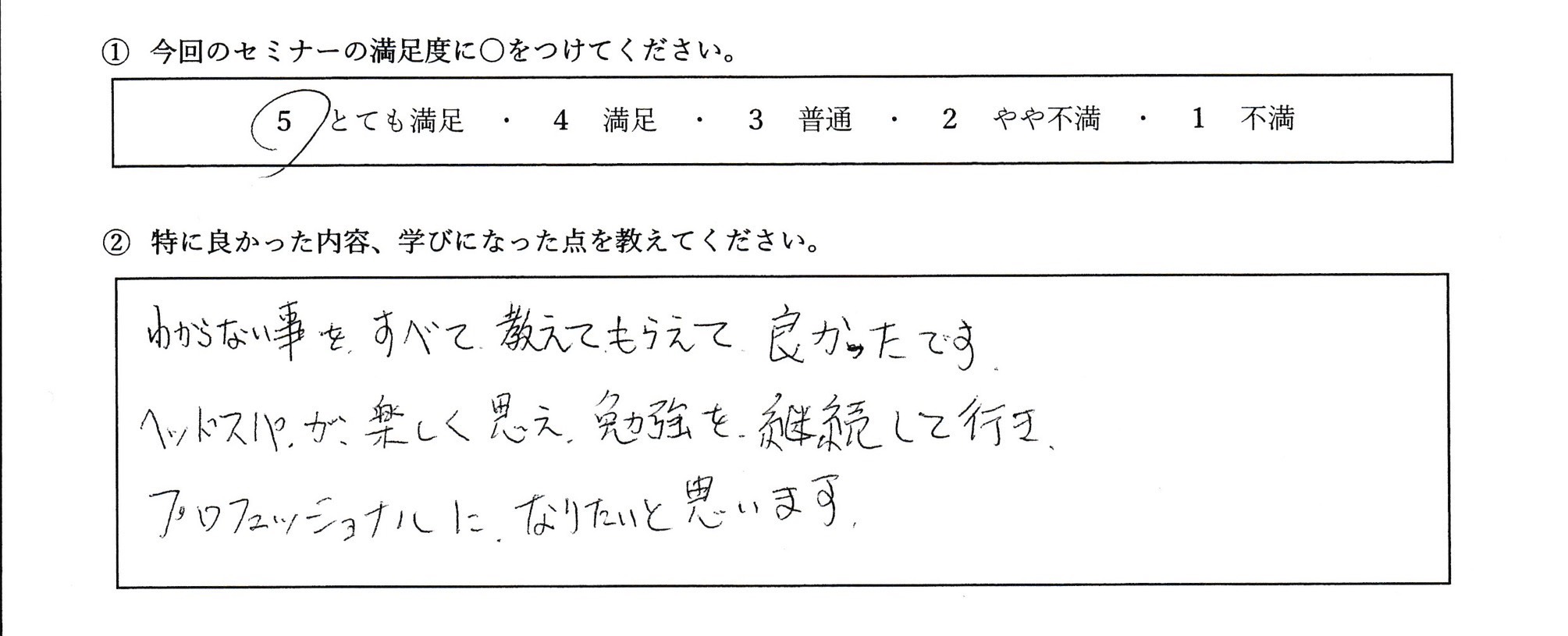 ヘッドスパが楽しく思え、継続して勉強していきたいと思いました。